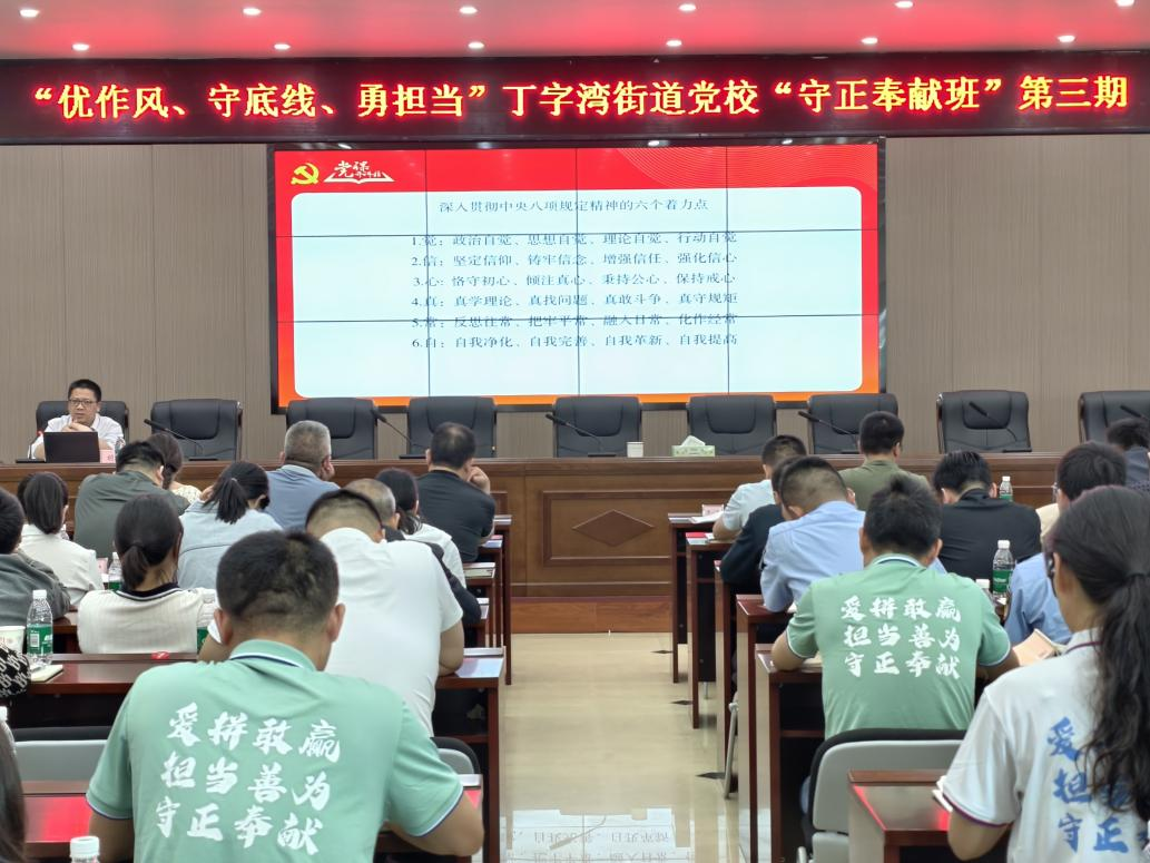 “思想有多高远,我们的脚步就能走多高远;纪律有多严实,我们的事业就会做多严实。”4月25日下午,长沙望城区丁字湾街道党校开展“优作风、守底线、勇担当”第三期“守正奉献班”暨丁青班四月份学习。街道党政领导、中层干部、村(社区)干部及丁青班学员百余人通过“专家授课+头雁分享+分组研讨”的形式享受了一场“视听盛宴”。