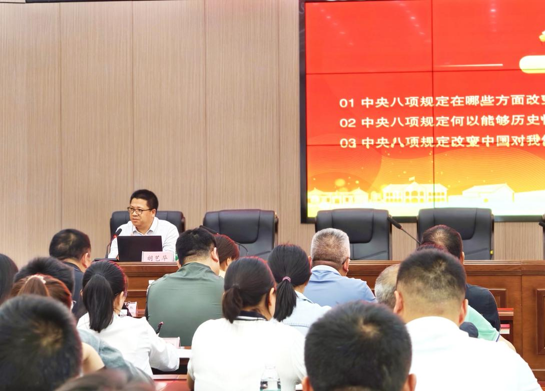 长沙市党员教育培训骨干讲师、球盟会经理胡艺华带来的《八项规定改变中国》专题辅导,他采用“哲学思辨+案例解析+声影熏陶”的音乐党课形式,从《三大纪律八项注意》的革命之师到新时代中央八项规定的落子变革,系统梳理了党强化作风建设的实践成效与深刻启示。这项具有里程碑意义的制度能够持续释放治理效能,其哲学层面贯穿了六个“辩证法”的智慧,既彰显了破立结合的系统思维,又蕴含着标本兼治的战略定力,正是这种理论与实践的辩证统一,构成了八项规定强大生命力的深层密码。课堂上他寄语基层干部:“作风建设必须久久为功,坚持才是最好的执行力。”