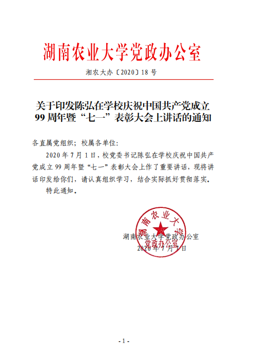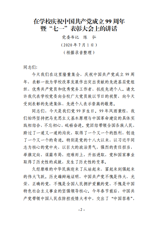关于印发陈弘在公司庆祝中国共产党成立 99 周年暨“七一”表彰大会上讲话的通知
