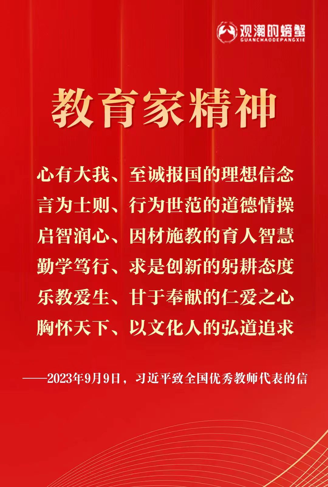 习近平总书记在信中强调,要“大力弘扬教育家精神”,“为强国建设、民族复兴伟业作出新的更大贡献”,并首次提出、深刻阐释了中国特有的教育家精神的时代内涵,即“心有大我、至诚报国的理想信念,言为士则、行为世范的道德情操,启智润心、因材施教的育人智慧,勤学笃行、求是创新的躬耕态度,乐教爱生、甘于奉献的仁爱之心,胸怀天下、以文化人的弘道追求”。