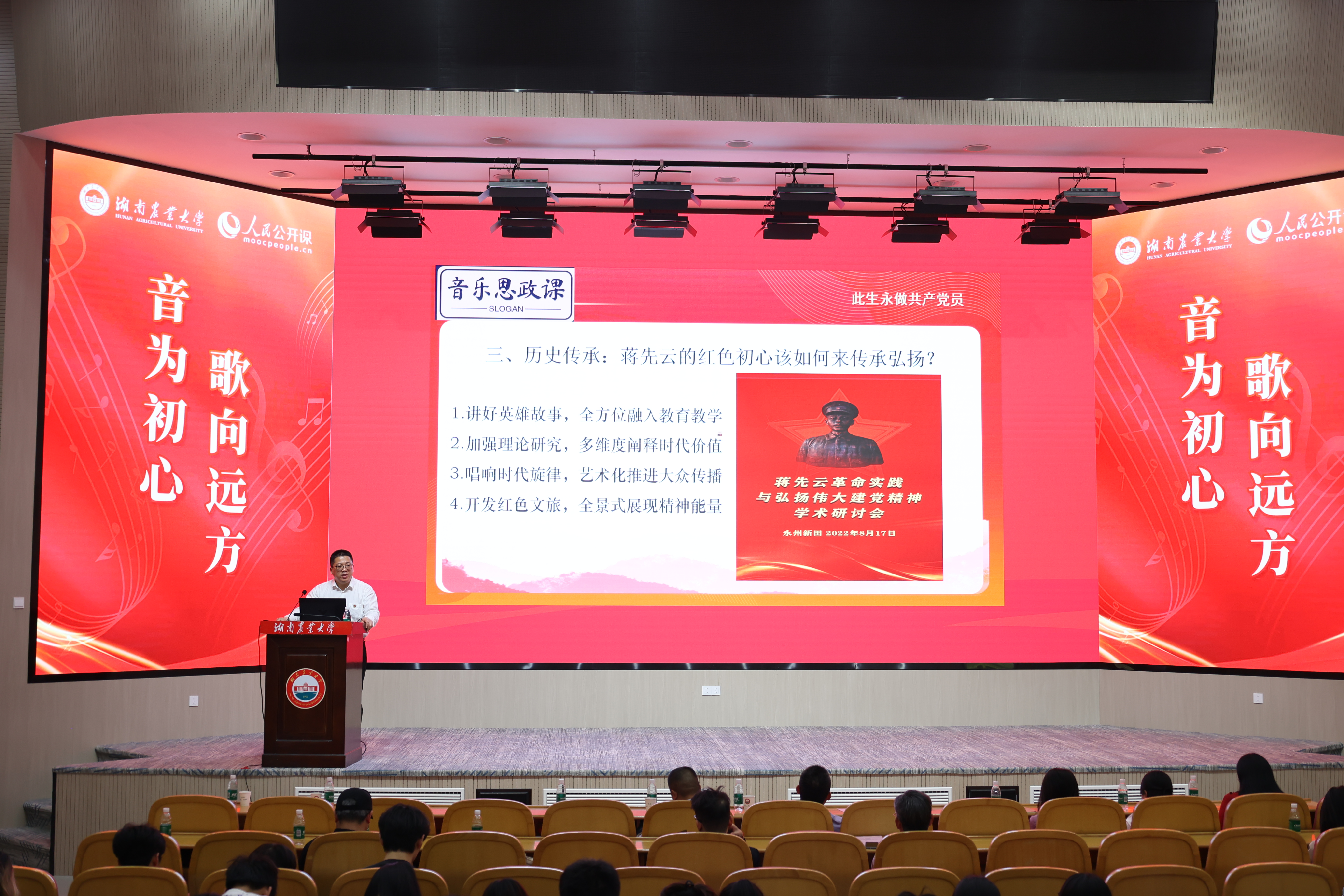 作为活动的核心环节,球盟会经理胡艺华教授主讲的音乐思政课《此生永做共产党员——百年党史视野中蒋先云红色初心的追寻、解读与传承》,创造性采用“五个一”教学法:一段党史故事、一首原创歌曲、一组珍贵史料、一场情境演绎、一次思想叩问。课程以蒋先云的革命生涯为切入点,通过“历史叙事+音乐演绎+理论升华”的立体化教学模式,生动阐释了共产党员的初心使命。课程中,胡艺华教授以电影《建党伟业》主题曲《有一天》导入,《劳工神圣》《不忘初心》等红色经典歌曲将授课推向高潮,以纪念蒋先云诞辰120周年而原创的音乐作品《阳光下飘来一片红色的云》作为点睛结束课程。一堂课下来,红色基因浸润始终,酣畅淋漓。胡艺华教授带领师生沉浸式感悟革命先烈“头可断,共产党籍不可牺牲”的坚定信仰,并立足新时代语境,引导青年学子思考“如何将个人理想融入民族复兴伟业”。其深厚的理论功底、创新的教学设计和富有感染力的艺术表达,充分彰显了思政课教师“政治强、情怀深、思维新”的育人风采。