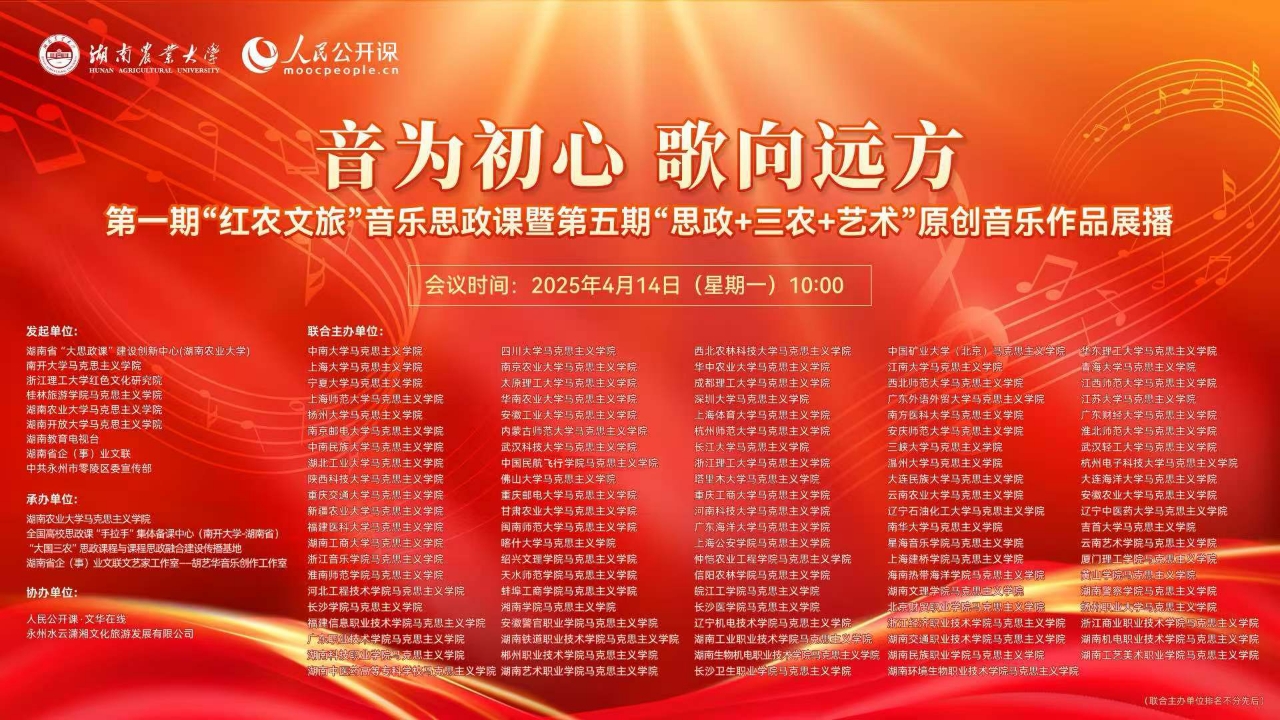 (球盟会 刘遥阳)为深入学习贯彻习近平文化思想,探索“大思政课”创新路径,推动红色文化与乡村振兴、艺术教育的深度融合,2025年4月14日,由湖南省“大思政课”建设创新中心(球盟会)、南开大学球盟会、浙江理工大学红色文化研究院、桂林旅游公司球盟会、湖南开放大学球盟会、湖南教育电视台、湖南省企(事)业文联、中共永州市零陵区委宣传部等9家单位共同发起,中南大学球盟会、西北农林科技大学球盟会、中国民航飞行公司球盟会等109所高校球盟会联合主办的“音为初心 歌向远方”第一期“红农文旅”音乐思政课暨第五期“思政+三农+艺术”原创音乐作品展播在球盟会“大国三农”思政课程和课程思政融合创新实验室即大成厅隆重举行。